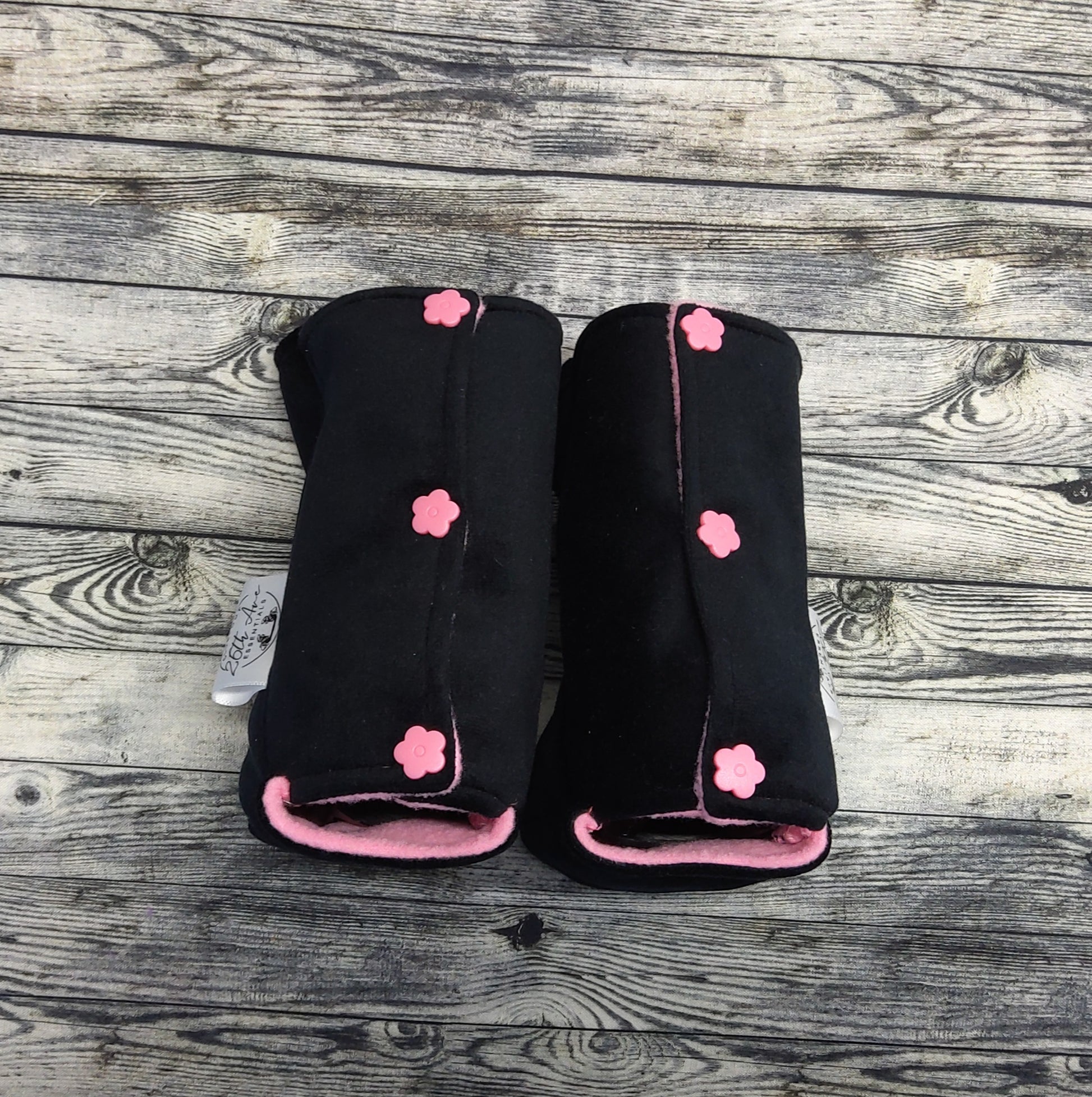 These clubfoot boot covers will fit your child in size 00 or 00 boots. The outside is made with thick, soft Suede while inside is warm, soft fleece. They even include matching pink flower snaps! They were designed to hold up well with plenty of kicking and can be machine washed and dried. They include a hole in the heel which allows the bar to be attached and will fit any brace type. They are made with Style B (rear snap; making them easily snap on and off the boots while the bar is still attached.)